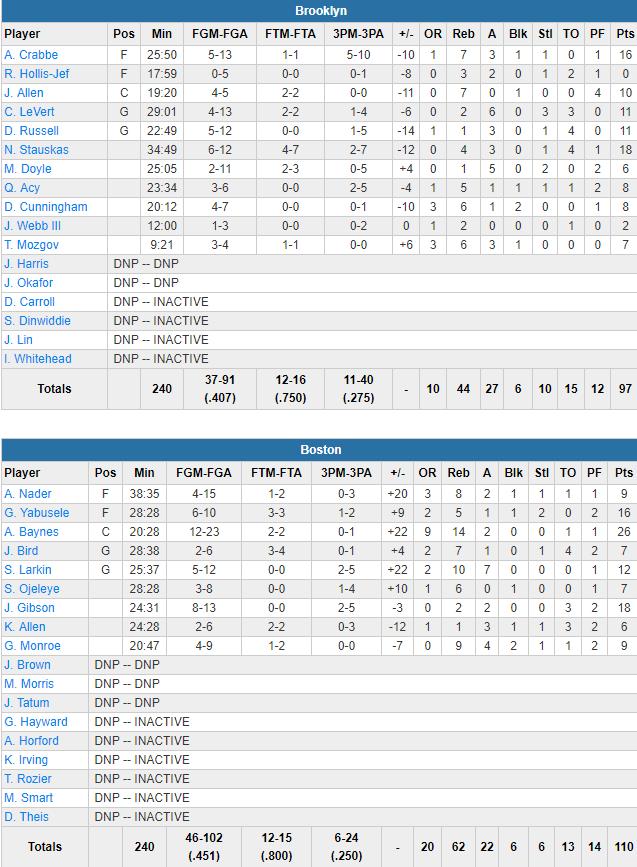 Les Celtics terminent sur une bonne note en dominant les Nets 110-97 dans le sillage du duo d’intérieurs Aron Baynes (26 points, 14 rebonds) et Guerscon Yabusele (16 points à 6/10, 5 rebonds et 2 interceptions). Le Français établit bien sûr son record en carrière. A noter que Jonathan Gibson brille en sortie de banc avec 18 points. En face les Nets shootent à seulement 40.7% et ont fait la course derrière tout le match malgré les 18 points de Nik Stauskas.