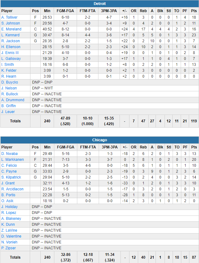Detroit pulvérise les Bulls 119-87 pour la dernière de la saison dans le sillage de 6 joueurs à au moins 10 points dont 23 points de Luke Kennard et 16 points, 17 rebonds, 4 contres et 4 interceptions d’Eric Moreland. Limités à 37.2% les Bulls n’ont pas excité et comptaient déjà un retard 35-21 après 12 minutes malgré 20 points de Lauri Markkanen.