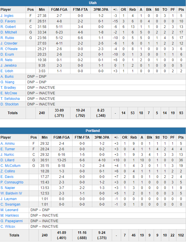 Damian Lillard a sorti un énorme match avec 36 points à 13/25 dont 4/10 à 3-pts en plus de 10 passes décisives. Il a été aidé par les 19 points de CJ McCollum et les 13 de Jusuf Nurkic. Portland a fait un joli boulot défensif puisque s’ils n’ont pas eu une énorme réussite avec 46.1%, ils ont limité le Jazz à un petit 37.1%. Donovan Mitchell termine avec 17 points mais à un horrible 6/23, alors que Ricky Rubio ajoute aussi 17 points et Rudy Gobert 13 points et 13 rebonds.