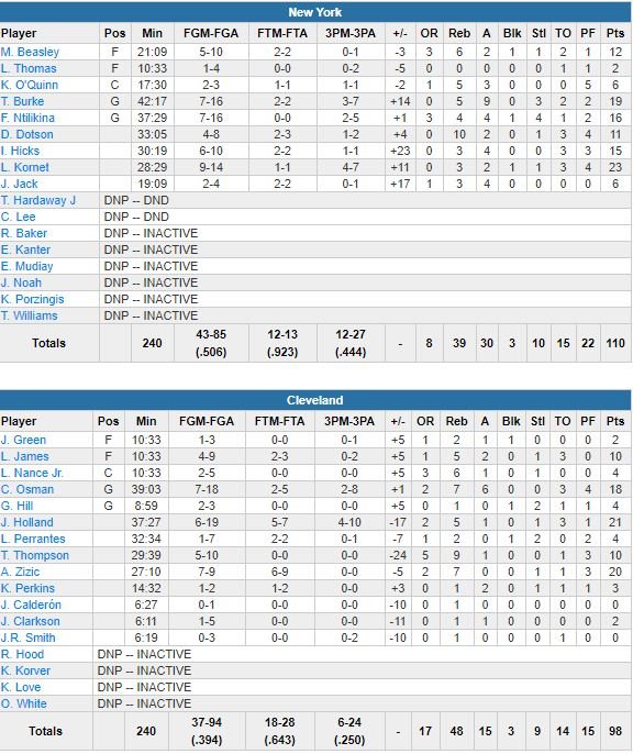 Pour la première fois en 15 ans de carrière, LeBron James a joué les 82 matchs d’une saison régulière. L’ailier a joué 10 minutes (10 points à 4/9, 5 rebonds, 2 passes) avant d’aller se reposer pour le 1er tour des playoffs, qui opposera Cleveland aux Pacers puisque les Cavs ont perdu 110-98 face aux Knicks cette nuit et que Philadelphie a de toute façon gagné contre Milwaukee.