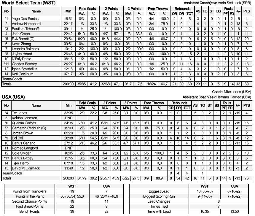 Le gros prospect canadien R.J. Barrett a terminé à 20 points à 8/20, 9 rebonds, 6 passes et 5 interceptions ! Côté US (l’équipe a été limité à 39.2% aux tirs), Bol Bol a compilé 12 points, 14 rebonds et 6 contres !