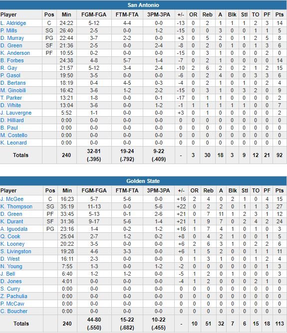 San Antonio n’aura pas mené une seconde lors de sa première visite à l’Oracle Arena ce soir, en ouverture des playoffs 2018. Étouffés d’entée, ils ont pris jusqu’à 28 points de retard avant de s’incliner 113-92 et n’ont jamais pu se relever d’un éclat reçu en fin de 1ère mi-temps.