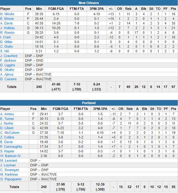 Devant de 19 points en fin de 3ème quart-temps, les Pelicans ont laissé revenir Portland à 1 point dans la dernière minute du dernier quart avec 2 opportunités de repasser devant. La défense a bien répondu à chaque fois, d’abord en forçant un ballon perdu de C.J. McCollum (19 points à 7/18) puis un raté de Damian Lillard (18 points à 6/23, 7 rebonds, 7 passes). Puis, après 2 lancers de Davis, Holiday a bâché le layup de Pat Connaughton pour sceller la victoire, 97-95.