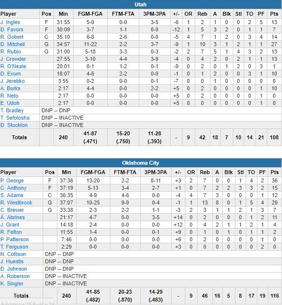 Sur son 7ème trois-points de la soirée, George a donné 13 points d’avance aux siens (79-66). Alex Abrines sur 2 tirs à 3-points consécutifs en début de 4ème quart-temps alors que le Jazz était revenu à 81-72 en fin de période a ensuite redonné 12 points d’avance au Thunder, 92-80, qui tiendra jusqu’au bout malgré un 36-35 encaissé dans le dernier quart.