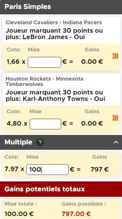 En vous inscrivant ici chez notre partenaire Betclic, votre premier pari est remboursé à hauteur de 100€*, pourquoi ne pas en profiter pour flamber un peu puisque vous ne risquez rien ? Ce soir on vous propose de miser sur des matchs à au moins 30 points de LeBron James et de Karl-Anthony Towns.