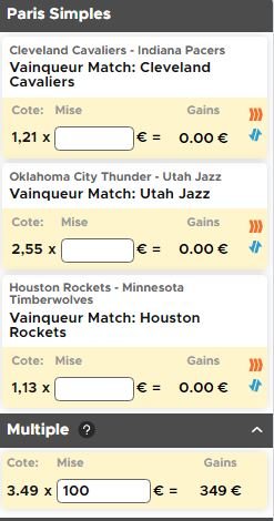 Cela nous donne une cote à 3,49 soit un gain de 249€ en mettant les 100€ du pari remboursé.