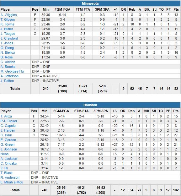 Les Wolves (16 ballons perdus à 9) devant 23-18 après 12 minutes, Houston a infligé un 62-35 à ses adversaires sur les 2 quarts-temps suivants avant de tranquillement gérer son avance (l’écart est monté jusqu’à 27 points) sur les 12 dernières minutes. De quoi camoufler l’horrible pourcentage de James Harden, auteur de 12 points à 2/18, 4 rebonds, 7 passes, 3 contres, 3 interceptions et 3 ballons perdus en 30 minutes. Et plus globalement l’horrible pourcentage de l’équipe : 36.5%. Gerald Green (21 points à 7/17, 12 rebonds), Chris Paul (27 points à 10/18, 8 passes) et Trevor Ariza (15 points à 5/14) se sont occupés du scoring alors que l’équipe a limité Minnesota à 38.8% sur le match.