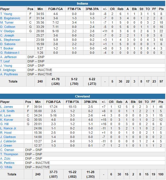 Dans le cinq majeur, Kyle Korver a apporté 12 points, tous à 3-points, mais a aussi provoqué 2 passages en force. Myles Turner est lui le deuxième meilleur marqueur d’Indiana derrière Oladipo avec 18 points. L’équipe (6/22 à 3-points contre 11/28) est revenue d’un déficit de 18 points et n’était plus mené 95-92 lorsque Oladipo a réussi à se libérer en sorte d’écran avant de manquer son fameux tir. James a rentré 3 lancers-francs dans les 22 dernières secondes pour assurer la victoire.