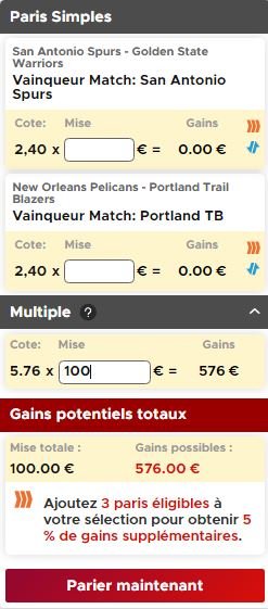 Cela nous donne une cote de 5,76 (elle peut varier) soit un gain potentiel de 476€ en mettant les 100€ du pari remboursé.