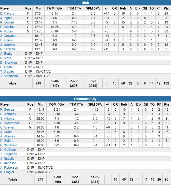OKC (mené 53-46 à la pause face aux 10 points de Rubio et 10 et 8 de Favors et à seulement 9/25 de loin) a gâché deux chances (deux tirs à 3-points manqués d’Anthony) de revenir dans la dernière minute alors qu’Utah était devant 99-95. Steven Adams a pris sa 5ème faute à 6’46 de la fin du 3ème quart et son équipe en retard 65-58 pourtant le Thunder a réussi un run pour passer devant 69-67. L’équipe a bouclé le quart-temps sur un 21-9 (79-74) en tenant ses adversaires à 7/23 dans le 3ème avant la prise de contrôle de Mitchell sur les 12 dernières minutes.