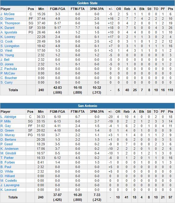 Les Spurs ont marqué les 6 premiers points du match (dont un gros poster de Rudy Gay sur JaVale McGee) avant que les Warriors (6 joueurs à au moins 10 points dont Shaun Livingston avec 16) ne commencent à dominer, en remportant chacun des 4 quarts-temps de la partie et en prenant jusqu’à 19 points d’avance. Comme lors des matchs précédents, Kevin Durant et Klay Thompson ont fait très mal aux Texans avec respectivement 26 points à 9/17, 7 rebonds et 5 passes et 19 points à 8/17.