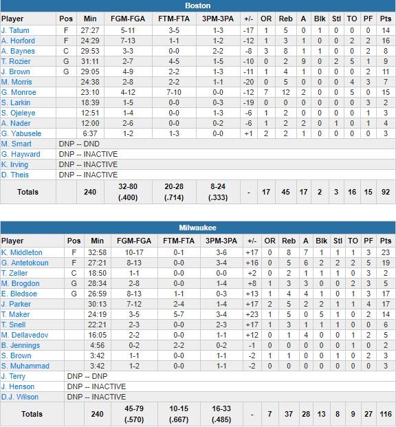 Eric Bledsoe et Jabari Parker (30 minutes de jeu contre 24 au Game 2) ont chacun ajouté 17 points au boxscore, Thon Maker 14 points et 5 contres, Matthew Dellavedova 5 points et 4 passes et une bonne défense sur Terry Rozier, limité à 9 points à 2/7 aux tirs et 5 ballons perdus. Boston a passé près de 11 minutes de jeu sans inscrire le moindre panier en 1ère mi-temps ! Al Horford a terminé meilleur marqueur des verts avec 16 points, mais son équipe a pris 23 points de retard à la pause et n’a pas fait mieux que revenir à 76-62 à 3’06 de la fin du 3ème quart sur un 3-points de Jayson Tatum.