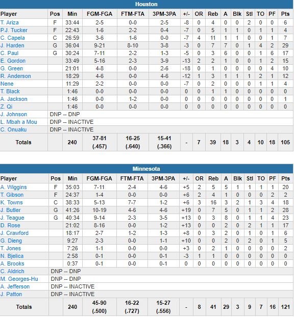 James Harden a terminé à 29 points (10/21, 7 rebonds, 7 passes), Chris Paul 17 (7/11, 6 passes) mais Houston n’a shooté qu’à 15/41 derrière la ligne. Towns a démarré son match difficilement puisqu’il n’a pas tenté un shoot du 1er quart-temps, avant de se rattraper dans le 2ème avec 10 points en 9 minutes avant la pause, où Minnesota était devant d’un point, 52-51, après que Houston ait effacé un déficit de 11 points en marquant 4 tirs à 3-points sur ses 7 dernières possessions.