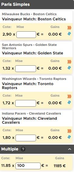 Cela nous donne une cote de 11.85 (elle peut varier) soit un gain potentiel de 1085€ en mettant les 100€ du pari remboursé.