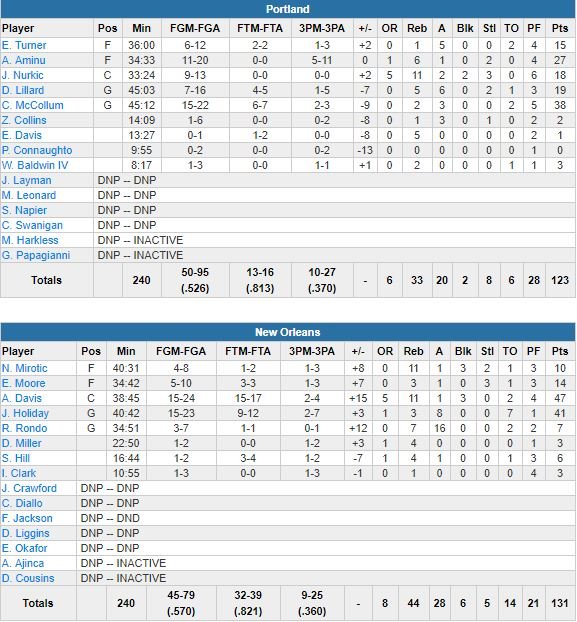 Portland n’a rien lâché en passant de -15 en seconde mi-temps à seulement -1 sur un layup d’Aminu (27 points) à 5’08 de la fin, mais Davis a répondu en marquant 12 points sur les dernières 4’56, un run démarré par un layup plus la faute et un 3-points. Holiday s’est lui occupé des dernières 2’52 avec 6 points. La paire a inscrit tous les points de son équipe sauf un sur cette période de 5 minutes. C.J. McCollum a terminé à 38 points (15/22) pour les Blazers, devant Aminu, Lillard (19 points à 7/16, 5 rebonds, 6 passes) et Nurkic (18 points à 9/13, 11 rebonds, 6 fautes).