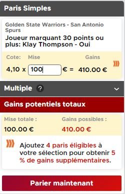 En vous inscrivant ici chez notre partenaire Betclic, votre premier pari est remboursé à hauteur de 100€*, pourquoi ne pas en profiter pour flamber un peu puisque vous ne risquez rien ? Ce soir on vous propose de miser sur un match à au moins 30 points de Klay Thompson. Lors du Game 4, il avait été limité à 12 points à 4/16 !