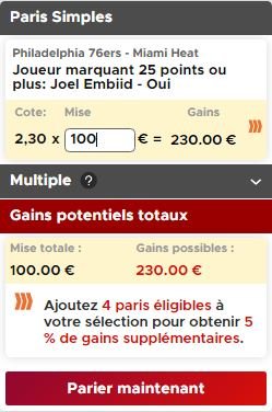Pour un pari un peu moins risqué (mais risqué quand même !), on vous propose de miser sur un match à au moins 25 points de Joel Embiid. Depuis son retour, le pivot n’a pas encore passé la barre des 25, avec 14 points au Game 3 et 23 au Game 4.