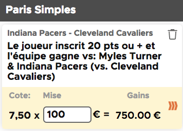 En vous inscrivant ici chez notre partenaire Betclic, votre premier pari est remboursé à hauteur de 100€*, pourquoi ne pas en profiter pour flamber un peu puisque vous ne risquez rien ? Ce soir on vous propose de miser sur un match à au moins 20 points de Myles Turner (qui trois fois sur cinq dans la série a atteint ou dépassé la barre des 16 points) dans une victoire des Pacers face aux Cavs à domicile :