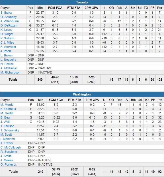 DeMar DeRozan (16 points à 6/18, 2 rebonds et 4 passes), plus petit match au scoring de la série) et Lowry en train de souffler sur le banc au début du 4ème, VanVleet a montré la voie aux remplaçants malgré son épaule droite douloureuse qui l’avait limité à 3 minutes de jeu dans toute la série hier. DeRozan et Lowry n’ont joué que 33 minutes et demi et 31 minutes et de mi, contre 40 chacun pour l’autre duo d’arrières All-Stars de la rencontre, John Wall (23 points à 9/22, 5 rebonds et 8 passes) – bien gêné par Pascal Siakam – et Bradley Beal -bien gêné par VanVleet – (32 points à 10/22, 2 contres, 6 ballons perdus).