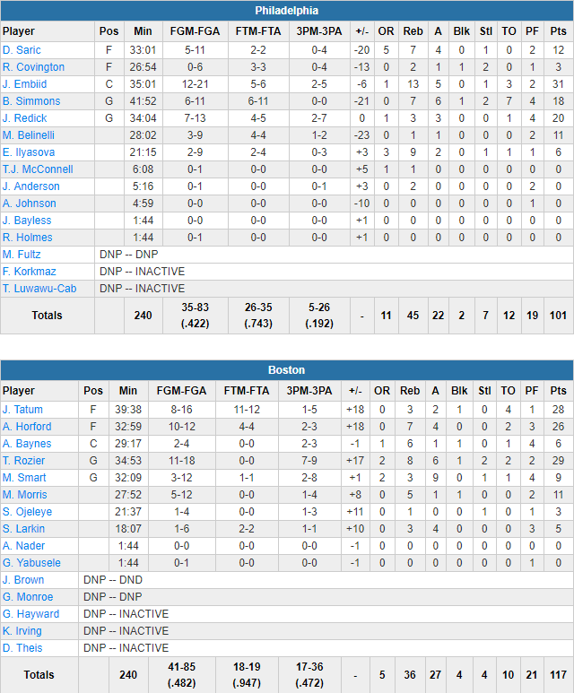 Performant en attaque, Boston a shooté à 48.2% dont un superbe 17/35 à 3-pts pour 27 passes décisives et seulement 10 ballons perdus. L’équipe de Brad Stevens s’est appuyée sur un superbe trio Terry Rozier (29 points, record en carrière, à 11/18, 8 rebonds et 6 passes), Al Horford (26 points à 10/12, 7 rebonds et 4 passes) et Jayson Tatum (28 points à 8/16, record en carrière en playoffs). En sortie de banc Marcus Morris a été précieux avec 11 points et 5 rebonds alors que Marcus Smart, titularisé en l’absence de Jaylen Brown, signe 9 points et 9 passes à un petit 3/12. En face les Sixers ont eu du mal en défense et n’ont pas eu la même réussite en attaque avec seulement 42.2% de leurs tentatives réussies dont un horrible 5/26 à 3-pts. Joel Embiid a pourtant planté 31 points à 12/21 en plus de 13 rebonds et 5 passes. JJ Redick ajoute lui 20 points à 7/13 et Ben Simmons 18 points à 6/11, 7 rebonds, 6 passes mais 7 ballons perdus.