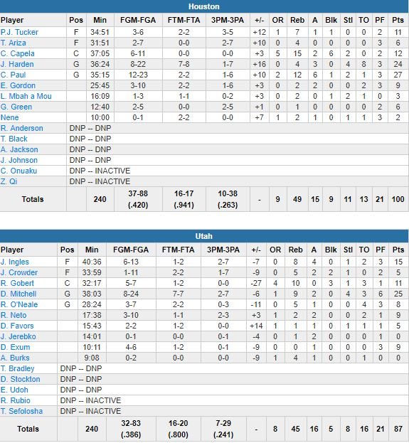 À noter : devant de jusqu’à 19 points, les Rockets étaient à +15 dans le 2ème quart-temps avant de voir Utah revenir à 51-46 sur deux 3-points consécutifs de Mitchell. À la pause, les hommes de Mike D’Antoni avaient repris 10 points d’avance. Aucune des deux équipes n’a été adroite à 3-points (7/29 pour le Jazz, 10/38 pour les Rockets). Déjà sans Ricky Rubio, Utah a perdu Dante Exum (9 points dans le 1er quart mais 3 fautes en défendant sur Harden) sur une blessure à un ischio-jambier. Joe Ingles a terminé à 15 points à 6/13, 8 rebonds, 4 passes, Rudy Gobert 11 points à 5/7, 10 rebonds, 3 contres.