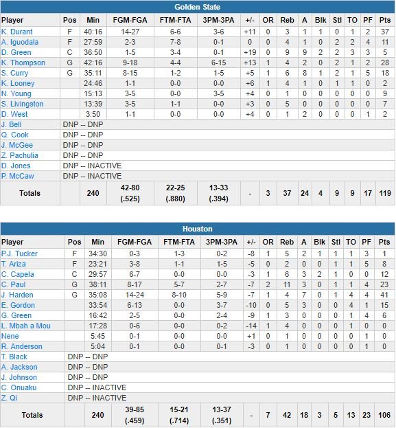 À noter : Chris Paul termine à 23 points à 11/17, 11 rebonds et 3 passes, Clint Capela 12 points, 6 rebonds et 2 contres. Andre Iguodala est le seul autre Warrior en dehors du trio Durant – Thompson – Curry à atteindre les 10 points avec 11 à 2/3. Golden State a perdu 9 ballons, contre 13 pour Houston. Les Warriors ont shooté à 52.5%, les Rockets 45.9%.