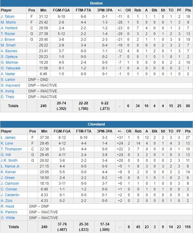 C’est George Hill (13 points), transparent sur les deux premiers matchs, qui a lancé les Cavs dans le match avec pour commencer un layup en début de match suivi de 3 tirs à 3-points dans le 1er quart. À 2/10 et avec 4 ballons perdus, Boston s’est vite retrouvé mené 27-11 et ne s’en remettra jamais (29-24 dans le 2ème, 26-22 dans le 3ème, 29-23 dans le 4ème). Gêné par les fautes toute la soirée et une défense concentrée sur le fait de le ralentir, Jaylen Brown a terminé à 10 points (23 points de moyenne sur les 2 premiers matchs). Jayson Tatum a lui signé 18 points et Terry Rozier 13.