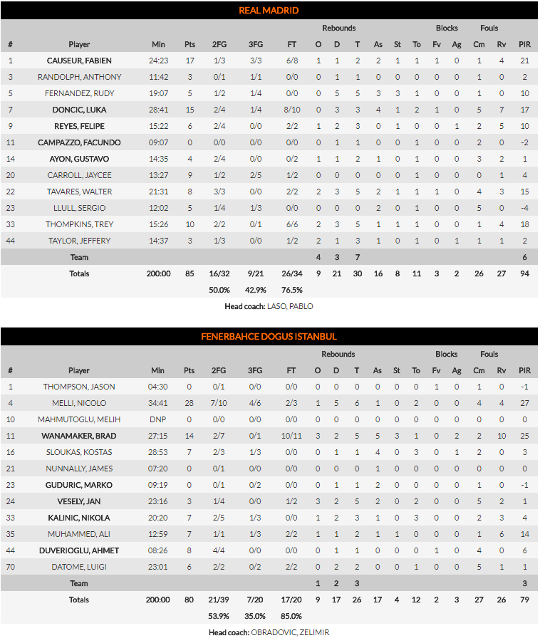 Le Français Fabien Causeur a été le grand artisan de ce succès avec un énorme 3ème quart durant lequel il a inscrit 12 points, en plus d’une excellente défense. Il termine avec 17 points, meilleur scoreur de son équipe. Luka Doncic sort un match solide avec 15 points à 3/8, 3 rebonds et 4 passes et remporte le seul titre majeur qui lui manquait sur le vieux continent, incroyable à 19 ans. Il est élu en plus MVP du Final Four !