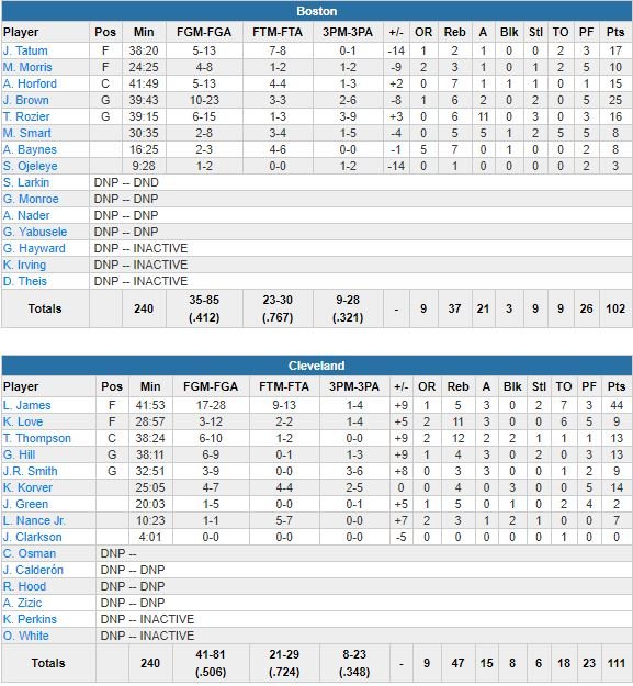 James a été épaulé par 3 autres joueurs à 10 points : Kyle Korver (14 points à 4/7 et 4 rebonds), Tristan Thompson (13 points à 6/10, 12 rebonds, 2 passes et 2 contres) et George Hill (13 points à 6/9, 4 rebonds et 3 passes). Kevin Love n’a pas été très brillant (9 points à 3/12, 11 rebonds et 3 passes), mais il a tout de même rentré un 3-points important dans le dernier quart. En face Jaylen Brown a retrouvé son efficacité au scoring avec 25 points (10/23) et 4 autres de ses coéquipiers ont signé au moins 10 points mais en retard de jusqu’à 19 points en 1ère mi-temps, les Celtics n’ont jamais réussi à rattraper leur retard.