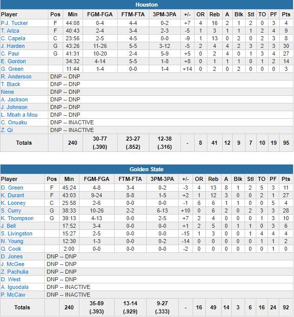 James Harden (30 points à 11/26, 4 rebonds, 4 passes, 2 contres, 3 interceptions) et Chris Paul (27 points à 10/20, 2 rebonds et 4 passes) ont été les deux seuls joueurs de Houston avec Eric Gordon (14 points à 4/14) à atteindre la barre des 10 points dans un match où les shoots ont eu bien du mal à rentrer pour les deux équipes (39% Rockets, 39.3% Warriors) et les Texans reviennent à 2-2 dans ces finales de conférence.