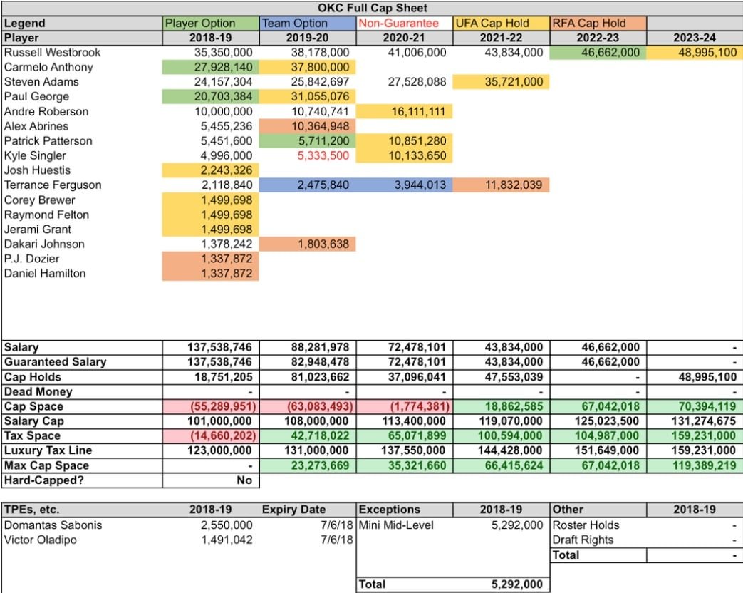Voici donc la situation pour le Thunder, et dés le premier coup d’œil, on se dit que ce n’est pas encourageant. (A noter que Melo a activé depuis sa player option et Paul George l’a déclinée)