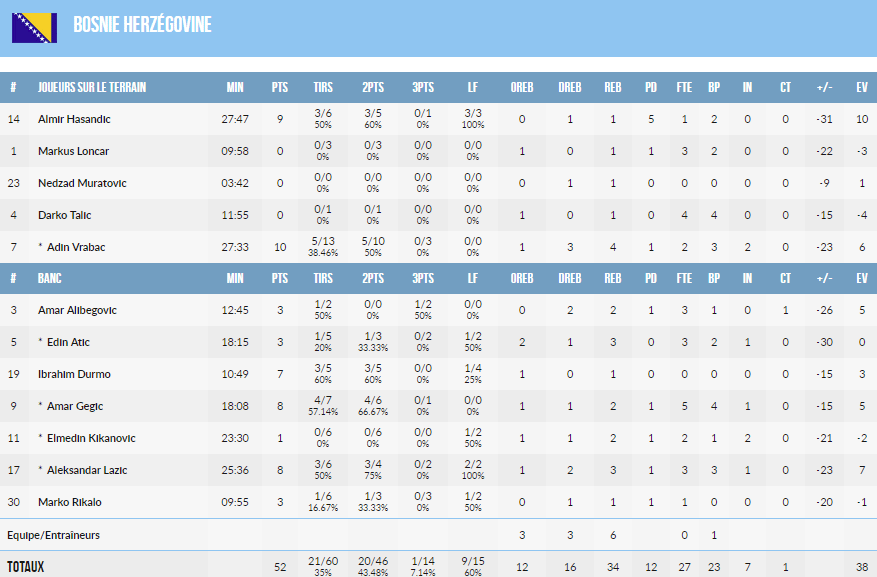 Avec le retour des NBAers la machine bleue a marché sur la Bosnie, qui leur avait donné du fil à retordre au match aller. Ils ont effectué une superbe prestation défensive, limitant leur adversaire à 35% et 23 ballons perdus. Rudy Gobert signe 16 points à 5/5 et 6 rebonds, Nando De Colo 15 points à 5/6 et Vincent Poirier 16 points à 5/5. Nico Batum compile 9 points et 7 passes.