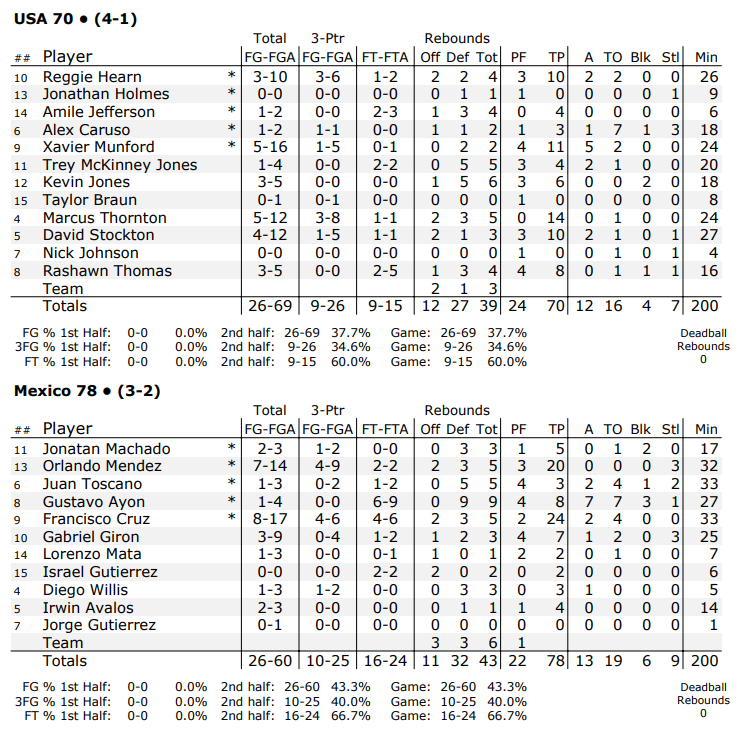 Le Mexique a étouffé d’entrée l’équipe de Jeff Van Gundy en remportant le premier quart 31-10 ! Team USA s’est accroché et a fini par revenir à moins de 10 points en dernier quart mais le Mexique a tenu jusqu’au bout.