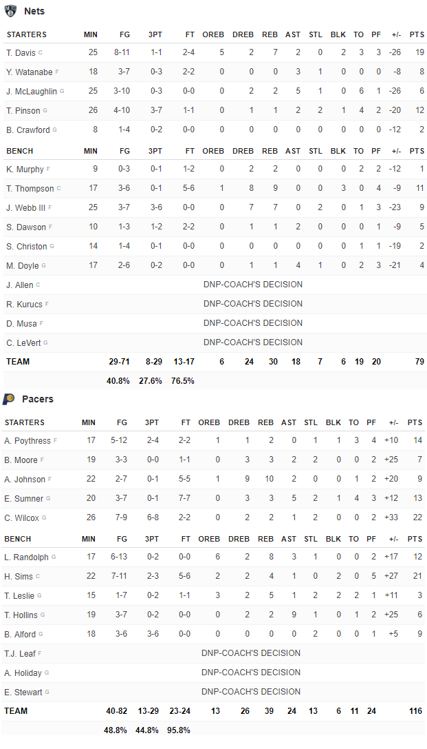 Pacers – Nets 116-79