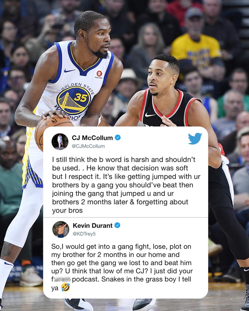 Kevin Durant : -Donc je suis pris dans une baston de gang, je perds, je complote derrière mon frère, chez nous, pendant 2 mois et ensuite je rejoins le gang contre qui on a perdu et je le tape ? Tu as une si faible estime de moi C.J. ? Je viens juste de faire ton putain de podcast. Snakes in the grass (référence au traître via le serpent, ndlr) mon gars je te le dis
