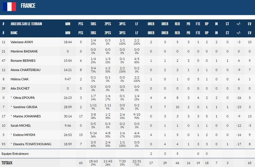 Les Bleues ont encaissé un 8-3 dès le match repris et étaient toujours menées de 19 points après 30 minutes malgré un quart-temps remporté 17-14. On a assisté à un gros réveil en début de 4ème avec un 9-0 pour des Bleues revenues à 10 points à 7’14 mais la maladresse de retour n’aidant pas, la Belgique a pu aller au bout sans soucis.