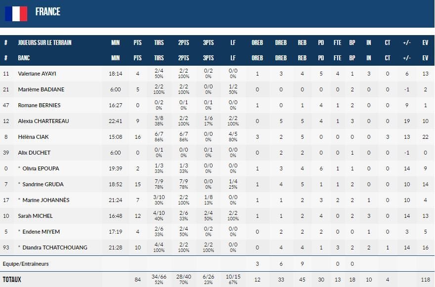 Quatre Françaises ont terminé à au moins 10 points dont la meilleure marqueuse Helena Ciak (16 points à 6/7 et 5 rebonds) et Sandrine Gruda (15 points à 7/9 et 5 rebonds). Rendez-vous demain pour jouer la 5ème place.