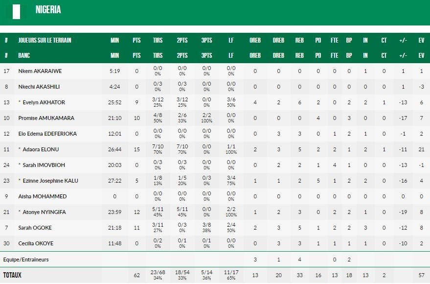 Battue par la Belgique en quart de finale hier, l’équipe de France affrontait le Nigeria en match de classement et a remporté son match 84-62. Le début de rencontre avait pourtant tourné à l’avantage adverse (de 2 points) mais les Bleues (52% de réussite aux tirs, avantage 45-33 au rebond) se sont vite relevées pour dominer le reste de la rencontre 66 à 42.