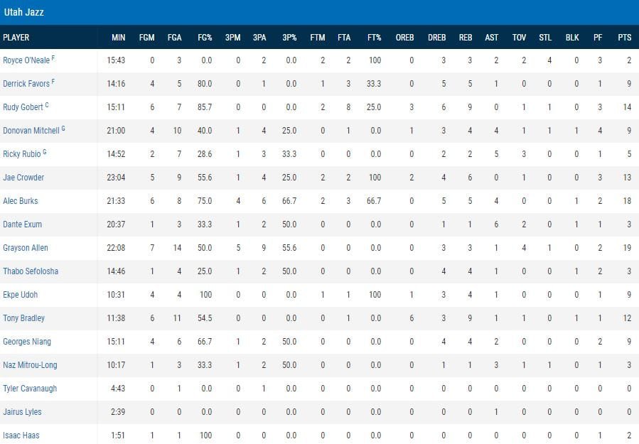 On notera bien sûr la première apparition de Kawhi Leonard avec les Raptors. L’ex-Spur a joué 19 minutes pour 12 points à 3/8, 1 rebond, 3 passes et 1 interception et son équipe a dominé Portland. Luka Doncic a lui passé presque 30 minutes sur le parquet pour sa première (face à Beijing) et signe 16 points à 5/7, 6 rebonds et 2 passes. De leurs côtés les champions en titre et malgré 21, 17 et 16 points du trio Steph Curry – Klay Thompson – Kevin Durant se sont inclinés contre les Wolves de Derrick Rose (16 points à 6/10 en 19 minutes). Utah a déroulé contre Perth avec un Grayson Allen à 19 points et un Rudy Gobert à 14 points à 6/7 et 9 rebonds.