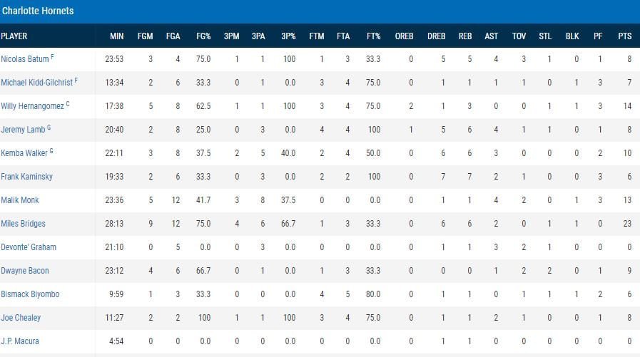 Avec 20 points à 7/14, 3 rebonds et 4 passes de Kyrie Irving, les Celtics ont pris leur revanche sur les Hornets (8 points à 3/4, 5 rebonds et 4 passes de Nicolas Batum, 23 points à 9/12 et 6 rebonds de Miles Bridges). Guerschon Yabusele a joué 12 minutes pour 8 points, 3 rebonds et 2 passes.