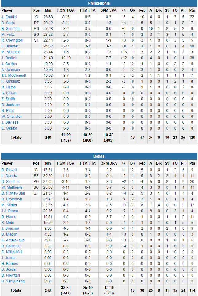 Les Mavs avaient pourtant pris un bien meilleur départ en menant 12-4, 22-10 puis même 33-20 sous l’impulsion de Dennis Smith Jr.. Mais sous l’impulsion du duo Joel Embiid et JJ Redick, les Sixers ont fait leur retour dans le match en second quart et sont même passés devant avant la mi-temps 64-62 sur un dernier tir à 3-pts de l’arrière, en feu. C’est encore Redick, sur 2 tirs à 3-pts, aidé par une réussite de Mike Muscala, qui a permis aux Sixers de prendre les commandes sur un 9-2. Ils ont ensuite tenu avec une dizaine de points d’avance jusqu’à la fin du match, malgré une tentative de retour de Dallas dans les 2 dernières minutes.