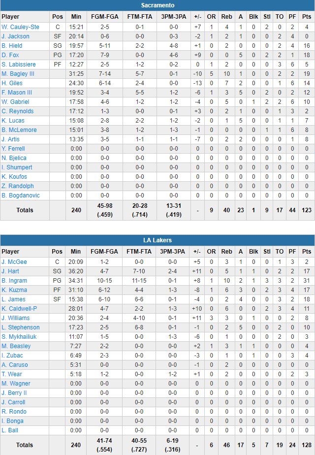 Première victoire pour les Lakers, qui dominent leurs voisin de Sacramento avec un super Brandon Ingram, auteur de 31 points à 10/15, 9 rebonds, 2 passes et 3 interceptions en 35 minutes. LeBron James ajoute 18 points à 6/10 et Kyle Kuzma et Josh Hart marquent 17 points chacun. Côté Kings, à noter le bon double double de Marvin Bagley avec 19 points et 10 rebonds tandis que De’Aaron Fox ajoute 18 points et 5 passes.