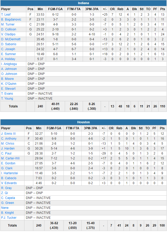 Premier match et première victoire des Pacers, qui s’imposent à Houston 110-100. Ils ont été menés par un excellent Victor Oladipo, auteur de 24 points à 9/18, tandis que TJ Leaf fait le job avec 13 points et 12 rebonds, tout comme Domantas Sabonis avec 15 points et 12 rebonds. En face James Harden compile 17 points, 5 rebonds, 10 passes mais 6 ballons perdus et Chris Paul a lui été discret avec 6 points à 2/7 et 5 passes. A noter le bon match de Carmelo Anthony, auteur de 16 points à 6/9 dont 4/6 à 3-pts et 5 rebonds.