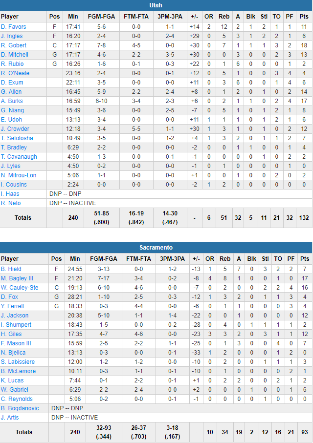 5 sur 5 pour le Jazz dans cette pré-saison suite à sa victoire de 39 points face aux Kings ! Il n’y a pas eu de suspense puisque les coéquipiers de Rudy Gobert ont remporté le 1er quart 39-10. Rudy Gobert signe 18 points à 7/8 et 7 rebonds en 17 minutes. Alec Burks ajoute 17 points et Grayson Allen 14. En face Marvin Bagley compile 17 points à 7/17 et 8 rebonds en 21 minutes.