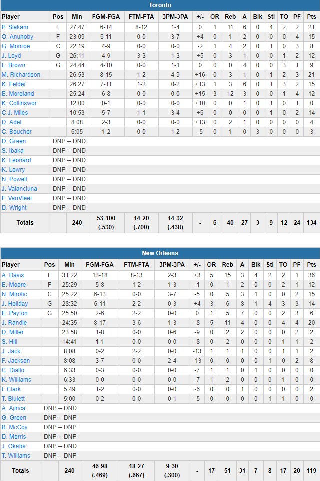 5ème défaite en 5 sorties pour les Pelicans, qui s’inclinent 134-119 face aux Raptors B. Anthony Davis a pourtant tout tenté avec 36 points à 13/18, 15 rebonds et 4 contres en 31 minutes. L’équipe B de Toronto a été menée par les 21 points de Pascal Siakam et Malachi Richardson. A noter les 20 points, 11 rebonds et 4 passes de Julius Randle.