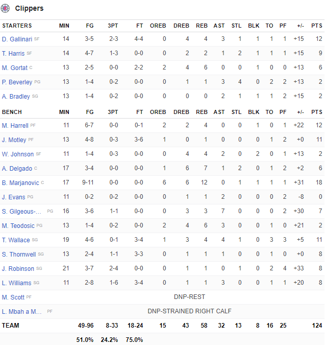 Enfin les Clippers écrabouillent le Maccabi Haifa de 48 points dans un match où Doc Rivers a fait tourner puisque aucun titulaire n’a joué plus de 14 minutes. Boban Marjanovic est encore une fois l’homme du match avec 18 points à 9/11 et 12 rebonds en 17 minutes.