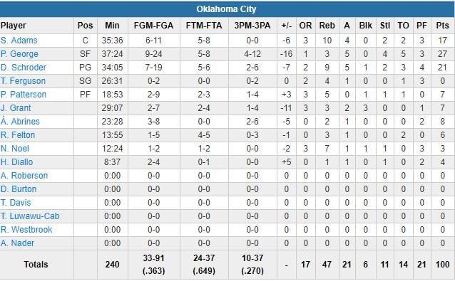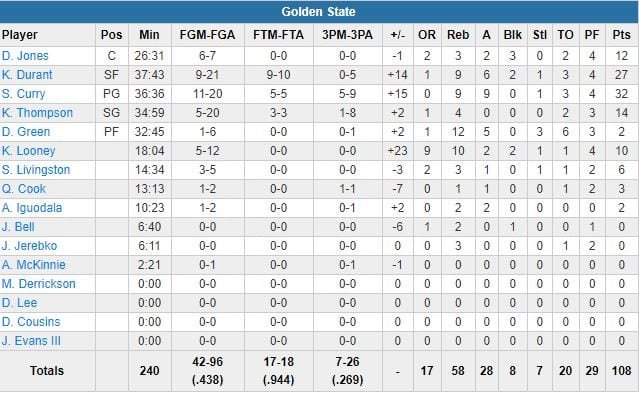 À noter : Damion Jones a terminé à 12 points à 6/7, 3 rebonds, 2 passes et 3 contres, Kevon Looney 10 points à 5/12 et 10 rebonds, Draymond Green 2 points à 1/6, 12 rebonds et 5 passes, Klay Thompson 14 points à 5/20 (1/8 à 3-points) et 4 rebonds. Golden State a perdu 20 ballons sur le match, contre 14 pour OKC.