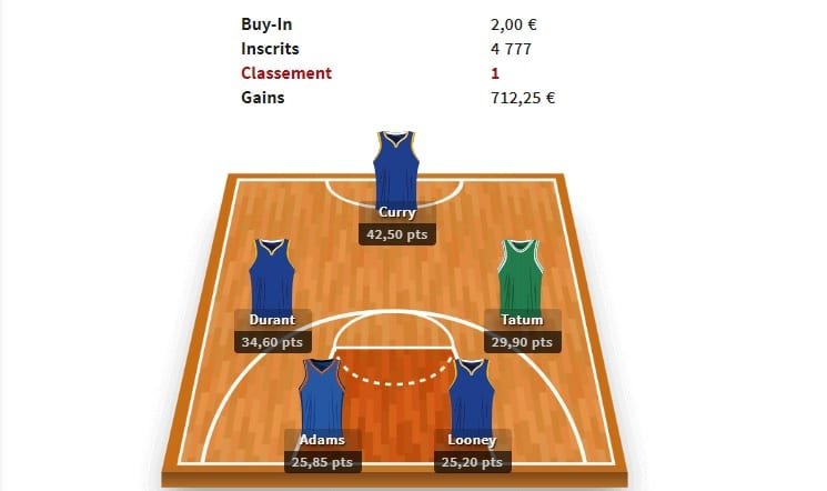 Ils sont 5 à se partager le pactole avec un cinq majeur composé de Stephen Curry, Kevin Durant, Jayson Tatum, Steven Adams et Kevon Looney. Ils gagnent ainsi 712.25€ chacun.