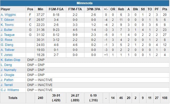 Les Spurs ont pris jusqu’à 11 points d’avance en 1ère mi-temps avant d’encaisser un 12-4 en fin de 2ème quart qui a permis à Minnesota de revenir à 48-46, même si Butler, Teague et Andrew Wiggins (20 points) ont été les seuls à marquer sur ce run. Karl-Anthony Towns (8 points à 2/6, 9 rebonds et 3 passes en 23 minutes) a lui pris sa 3ème faute à 2 minutes de la mi-temps avant de sortir pour 6 fautes à 4’18 de la fin du match, son équipe en retard de 7 points, 99-92.