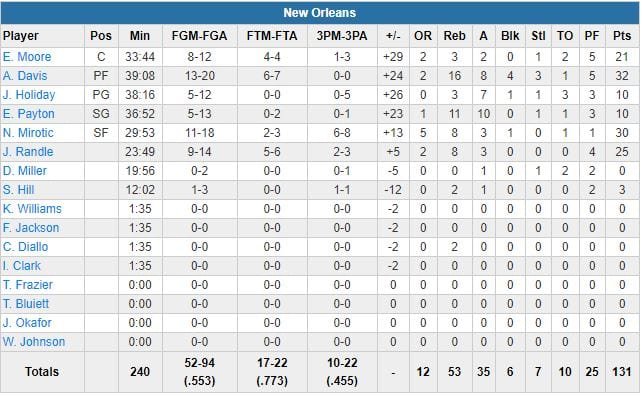 Le premier aligne 32 points à 13/20, 16 rebonds, 8 passes, 4 contres et 3 interceptions… de quoi donner le tournis, le second 30 points à 8/18 (6/8 à 3-points), 8 rebonds et 3 passes. Et ils étaient loin d’être seuls puisque deux autres joueurs atteignent les 20 points : E’Twaun Moore avec 21 points à 8/12 et Julius Randle avec 25 points à 9/14, 8 rebonds et 3 passes… en seulement 23 minutes. Côté Rockets Eric Gordon est le meilleur marqueur avec 21 points en sortie de banc, devant Chris Paul et P.J. Tucker (19 points) et James Harden, 18 points à 6/16, 9 rebonds et 10 passes.